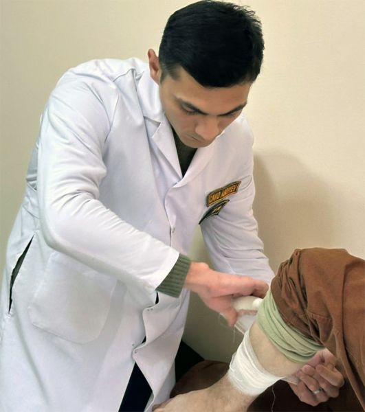 Tibb xidməti leytenantı Cavid Abdıyev hərbi hissənin tibb məntəqəsində əsgər Elşən Əlimovu müayinə edirdi. Müraciət edən əsgərin vəziyyəti diqqətlə yoxlanılır, ilkin tibbi müayinə aparılır və şikayətlərin səbəbi müəyyənləşdirilirdi. Həkim tərəfindən zəruri tibbi yardım göstərilərək, sağalma prosesinin sürətləndirilməsi üçün müvafiq tövsiyələr verilirdi. Eyni zamanda, əsgərin vəziyyətinin daha ətraflı qiymətləndirilməsi məqsədilə əlavə mütəxəssis müayinəsinə yönləndirilməsi də təmin olunurdu.