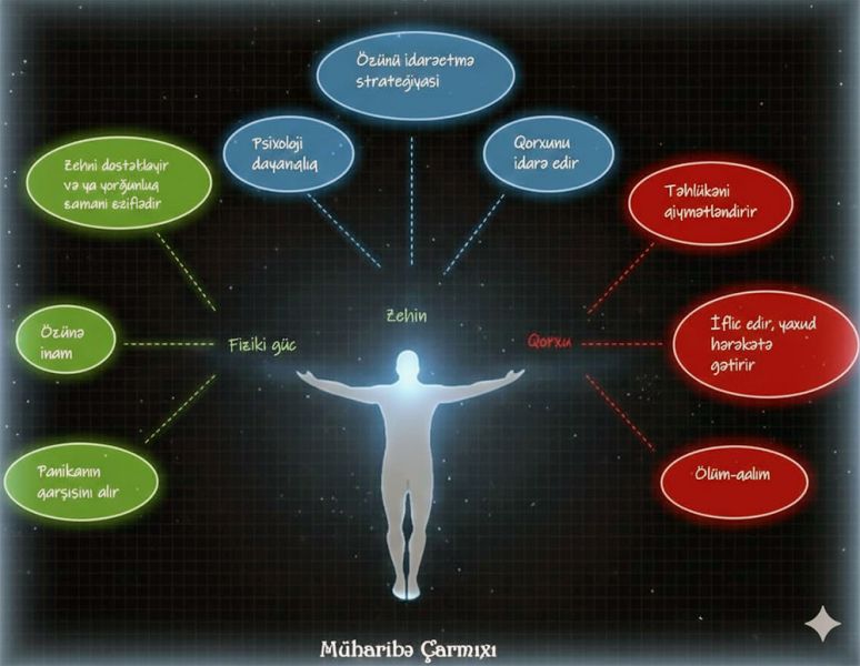 Müharibə döyüşçü üçün bir çarmıxdır: bir tərəfində qorxu, digər tərəfində fiziki tükənmə, mərkəzində isə zehni güc dayanır. Qorxu hər bir əsgərin daxilində mövcuddur, lakin onu idarə edə bilən döyüşçü zehni üstünlük qazanır. Fiziki güc bədəni irəli aparsa da, zehni güc onu döyüşdə saxlayan əsas dayaqdır. Bu üç amilin vəhdəti döyüşçünün taleyini müəyyənləşdirir.